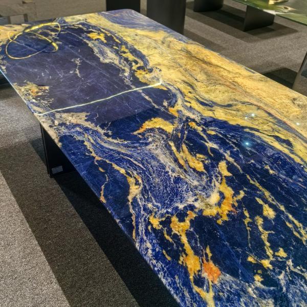 Cloisonne (Blue Sodalite Marble) is a premium surfacing material featuring a deep ocean-blue base intertwined with white veining and wave-like patterns. It is originating from Brazil, the "Kingdom of Foo