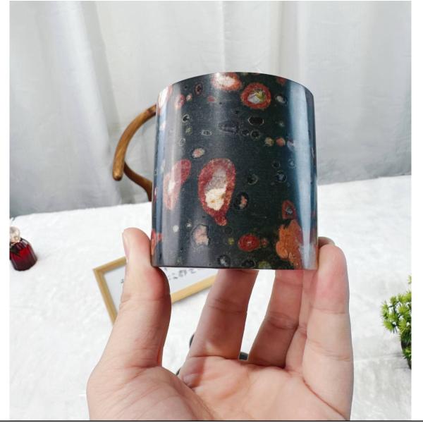 Holding this Chinese Plum Blossom Jade Marble Cup feels like stepping into a timeless, poetic realm of Eastern elegance. The cup’s deep, rich black body resembles a mysterious ink-wash painting under moonlight, while its crimson and amber veins evoke plum blossoms braving winter snow—delicate yet vibrant, like brushstrokes from a classical Chinese landscape painting.